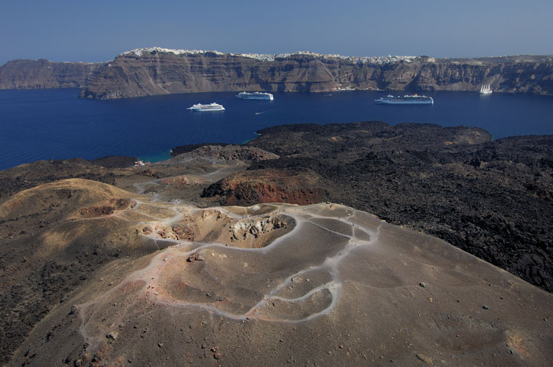 Η νεότερη χέρσος της ανατολικής Μεσογείου, το ενεργό ηφαιστειακό κέντρο της Νέας Καμένης δεσπόζει στο πρώτο πλάνο της αεροφωτογραφίας. Οι πλέον κοντινοί λόφοι είναι δημιούργημα των εκρήξεων του 1866-1870 (θόλος Γεωργίου, στο κέντρο με τους κεντρικούς κρατήρες της νησίδας) και του 1940 (θόλος Φουκέ, αριστερά). Στη συνέχεια διακρίνεται ο θόλος Νίκη του 1941 (ο λόφος με το έντονο κόκκινο χρώμα. Δεξιά απλώνονται οι λάβες του 1925-1926, ενώ ακόμα πιο μπροστά διακρίνονται τα παλαιότερα πετρώματα του νησιού: οι λάβες της Μικρής Καμένης του 1570, με τον όρμο της Ερινιάς στους πρόποδές τους. Το διαρκώς μεταβαλλόμενο, ασταθές και αφιλόξενο για τον άνθρωπο τοπίο της Νέας Καμένης (στη μεγαλύτερη έκτασή του δεν διαθέτει ούτε στοιχειώδες έδαφος) χρησιμοποιήθηκε μόνο τον 19ο αιώνα για να φιλοξενήσει οικήματα για θερμά λουτρά και χώρους επιδιόρθωσης των σκαφών των Σαντορινιών. Στο βάθος της εικόνας κυριαρχούν τα γκρεμνά της καλδέρας της Σαντορίνης, στεφανωμένα με τους οικισμούς των Φυρών, Φυροστεφανιού και Ημεροβιγλίου, ενοποιημένοι πλέον από τη συνεχή δόμηση των τελευταίων δύο δεκαετιών.