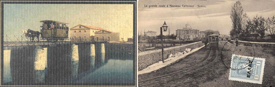 Ατμόμυλοι και καπνομάγαζα συμπλήρωσαν το νέο βιομηχανικό πρόσωπο του Καρλοβάσου, ενώ ισχυροί τοπικοί επιχειρηματίες, που πρωταγωνιστούσαν και στην πολιτική ζωή της Ηγεμονίας, προώθησαν σημαντικά δημόσια έργα και προίκισαν την πόλη με αξιόλογα δημόσια κτίρια και αρχοντικά. Το λιμάνι, έργο δύσκολο και μακρόχρονο, κατασκευάστηκε τις δύο τελευταίες δεκαετίες του 19ου αι. κάτω από το Παλαιό Καρλόβασι (εκτός της εικόνας, στο δεξιό άκρο – βλ. Εικόνα 5) και δημιούργησε άλλον έναν οικιστικό πυρήνα, τον Λιμένα Καρλοβάσου. Το 1905 εγκαινιάστηκε μια γραμμή ιππήλατου τραμ κατά μήκος της παραλίας (βλ. Εικόνα 6), που εξασφάλισε τη μεταφορά των εμπορευμάτων ανάμεσα στο λιμάνι και τα εργοστάσια. Την ίδια εποχή κατασκευάστηκε και η αμαξιτή παραλιακή οδός Βαθύ-Καρλόβασι. Το Νέο Καρλόβασι επεκτάθηκε προς την παραλία, διαμορφώνοντας μια νέα συνοικία με εμπορικά, τράπεζες και αρχοντικά. Το Χατζηγιάννειο Παρθεναγωγείο, το νέο κτίριο της Πορφυριάδος Σχολής, το Ηγεμονικό Μέγαρο, έδωσαν στην πόλη αέρα αρχοντιάς, ενώ η διευρυνόμενη εργατική τάξη αποκτούσε τις πρώτες οργανώσεις της: ανήσυχο και κινητικό, το Καρλόβασι βρέθηκε κατ’ επανάληψη στην πρώτη γραμμή των κοινωνικών αγώνων, αρχίζοντας πριν κιόλας από την ελληνική Επανάσταση.